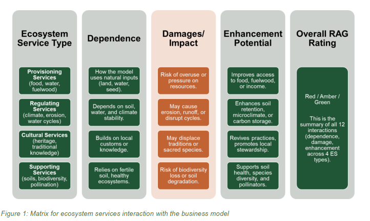 As we began integrating ecosystem services across the CSJ business models, it became clear that good intentions were not enough. Saying “nature” matters is one thing, and making it practical is another. We needed a consistent way to assess each model, not just to flag risks but also to spot untapped potential. And we needed a common language that made sense to everyone we work with, from farmers to financiers.